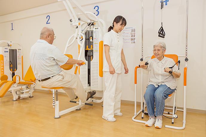 入居時に身体評価を行った結果をもとに、個別・集団リハビリのプログラムを提案・実施しています。マシンを完備した機能訓練スペースもいつでもご利用いただけます。また、「おしゃべり会」では俳句を詠むことで楽しみながら口腔体操をおこないます。