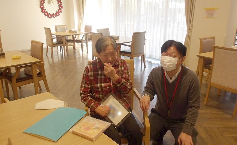認知症ケアの一環として、回想法を取り入れ、昔なじみの道具や懐かしい写真などを用いて思い出を振り返り、ご入居者様同士でお話をしていただいています。「うちにもあったよ!」「懐かしいね、こういうの。」と皆様当時のことを思い出し、懐かしそうにされています。回想法は認知症の進行を遅らせることに繋がるだけでなく、ご入居者様同士でコミュニケーションをとっていただくことで孤独感や不安を軽減し、意欲を向上させる効果も見込めると言われています。