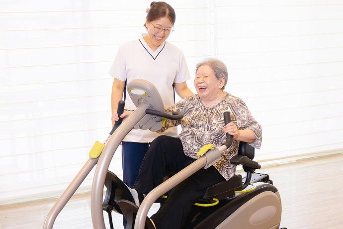 リハビリの先にある「〇〇したい」という想いに寄りそい、続けていただきやすいリハビリのご提案に力をいれています。機能訓練指導員がお一人おひとりのお身体に合わせたリハビリプランを作成し、さまざまなリハビリ機器を使用しながら楽しくお身体を動かしていただけるよう努めています。「今できること」「これからの目標」も伺いながら、毎日のリハビリが楽しみになるよう工夫をしています。