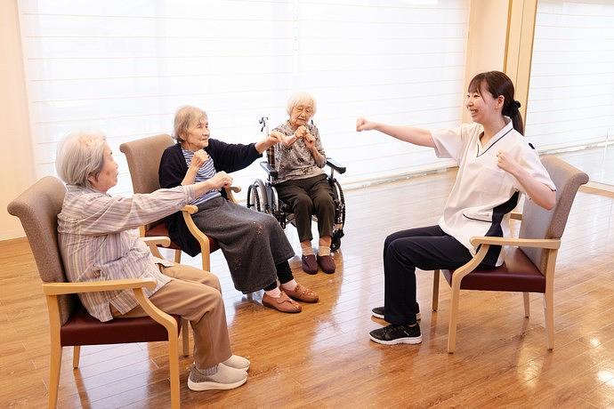 「○○したい」という想いを叶えたり、ご自身の趣味を続けていただくため、楽しく体を動かすことを目的とした集団体操をほぼ毎日実施しています。機能訓練指導員による集団リハビリは通常週1回実施し、ゆっくりお身体を動かす体操や発声しながら行う口腔体操など、ご友人と一緒に楽しみながら行っていただけるよう努めています。車椅子の方でも気軽にご参加いただけるような体操メニューも取り入れています。