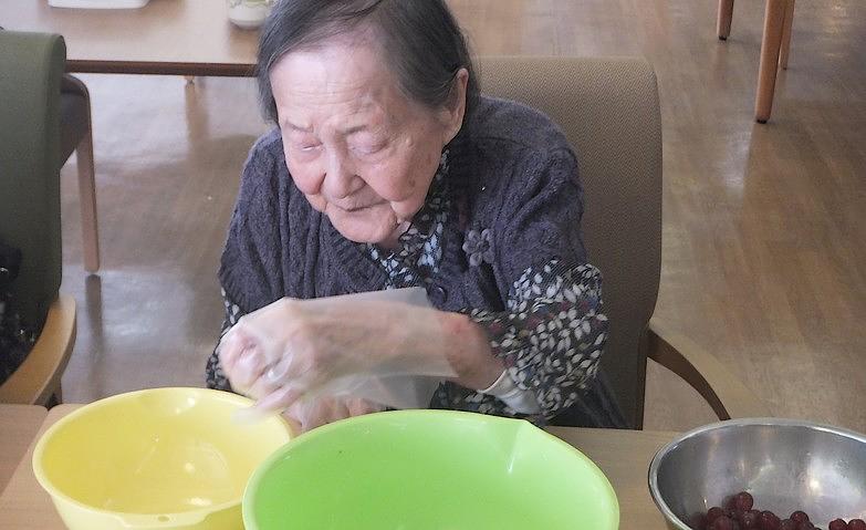 2025.09.27ぶどうジャム作り今月のカフェアクティビティでは、ぶどうのジャムを作りました。皆様は真剣なご様子でひと粒ずつ皮をむかれていました。「このひと手間が大事なのよね」と、むいた皮もパックにつめてしっかりと活用!きれいな紫色のジャムが完成すると、「こんなにきれいに色が出るのね!」と皆様はとても嬉しそうなご様子でした!