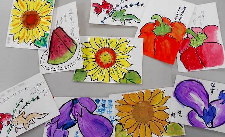 2025.08.14暑中見舞い申し上げます。絵具を使って、大切な方へ送る絵手紙を作成していただきました。鮮やかで繊細な風情のあるイラストを描いていただき、心温まる作品が完成しました。