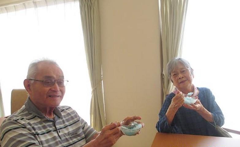 2025.09.03夏の風物詩~かき氷~猛暑が続く日々ですが、ご入居者様に「涼」を感じていただこうと、かき氷を提供させていただきました。皆様にお好みのシロップを選んでいただき、召し上がっていただきました。「冷たい!けど、おいしい!」などのお声をいただくことができ、皆様は楽しまれていたご様子でした。