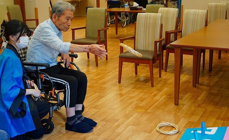 2025.09.18夏祭り先日、当ホームで夏祭りを行いました。ゲームの輪投げを楽しんでいただいたあとは、かき氷を召し上がっていただきました。輪投げの台はスタッフの手作りです。ホーム内には皆様の楽しそうな声が響いており、夏のよい思い出になったご様子でした。