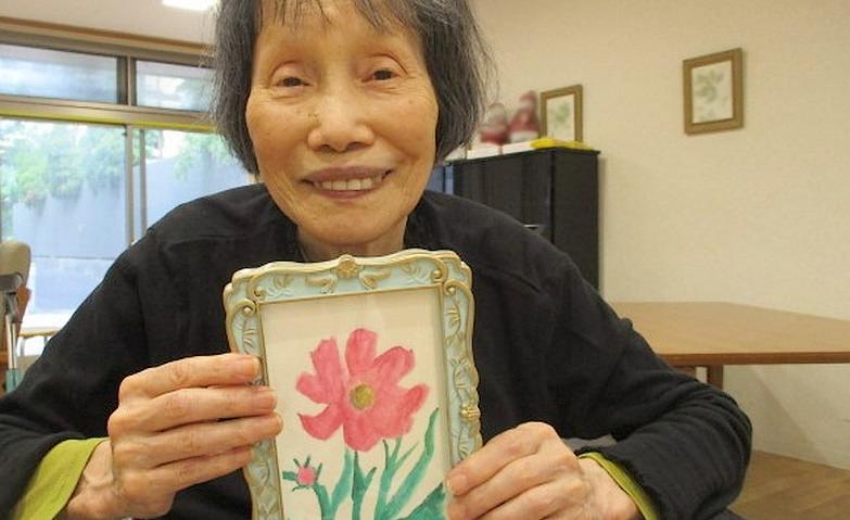 2025.10.01水彩画教室外部より先生をお招きして水彩画教室を開催しました。秋の花のコスモスを水彩絵具を使って色を塗られたご入居者様。お部屋に飾っていただけるよう、額に入れてお渡ししました。
