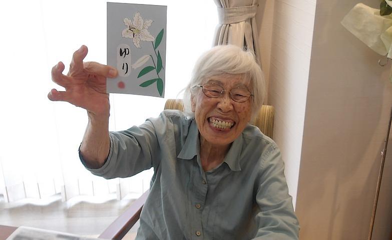 2025.08.04書道~ユリの花~先日の書道では、ユリ花の絵葉書づくりをしました。背景は素材や色も高級感のあるものを使用しており、ご入居者様の書かれた字も相まってきれいな白いユリの花が際立つような作品になりました。出来上がった作品は多くの方がお部屋に飾られています。