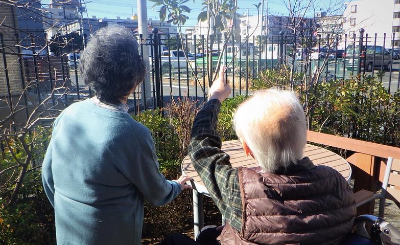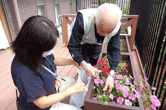 剪定をされるご入居者様 温かみのあるサービスで、その方らしい生活のサポートに努めています。
