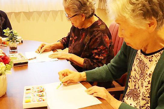 パステルアートに取り組むご入居者様 「住民会」を通じて、ご入居者様の「やりたい」をホームの運営に活かしています。