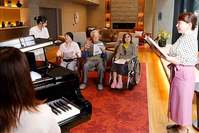 合唱アクティビティに参加されるご入居者様 暮らしにハリと楽しみを。多彩なアクティビティを実施しています。