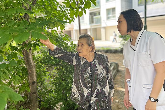 「ミニ大通り」を散策されるご入居者様 身近に緑を感じられる落ち着いた環境のなか、ゆったりとした日々を。