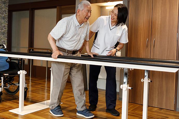 ご入居者様お一人おひとりのお身体の状態やご要望に応じて、生活の質(QOL)の向上を目指す多様なプログラムを機能訓練指導員がご提案。「野球観戦をしたい」「山登りをしたい」「一人で自由にトイレに行けるようになりたい」といったご入居者様の「やりたいこと」や「ありたい姿」を目標に掲げ、機能訓練指導員やサービススタッフ、看護職員など多職種が連携して「夢」の実現に向けたサポートをさせていただきます。いつまでもご自分らしくいきいきとお過ごしいただけるよう、リハビリを通じて機能向上だけでなく、精神面(こころ)のサポートにも努めてまいります。