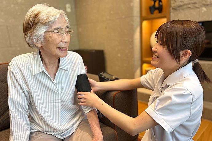 看護職員を24時間配置し、胃ろう・たんの吸引など、夜間の医療的ケア(診療の補助)にも対応。定期的に体温・血圧などのチェックを行うほか、日々のご様子の変化に目を配り、かかりつけ医の指示のもと健康管理を行います。また、ご入居後にお身体の状態が変化した際や、夜間の体調急変時にも、看護職員が医師と連携して応じますので、安心感のなかお過ごしいただけるようなサポートに努めてまいります。