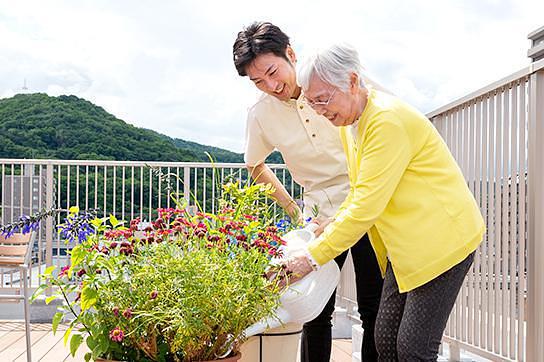 植物のお手入れをされるご入居者様 暮らしの中に季節を感じていただけるように。