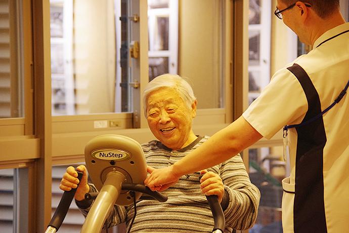 機能訓練指導員が作成する個別のプランのもとに行う個別リハビリでは、お身体の状態やご要望に合わせて、生活の質(QOL)の向上を目指した多様なプログラムを機能訓練指導員がご提案。このほかにも、足腰が不安な方の筋力維持を目的とした体操や、リハビリ機器を使用した運動などを通して機能向上や精神面(こころ)のサポートを図ります。歩行訓練などは、機能訓練指導員の作成したリハビリプランのもと介護職員が行い、安心感のある生活を送っていただけるようお手伝いをさせていただきます。