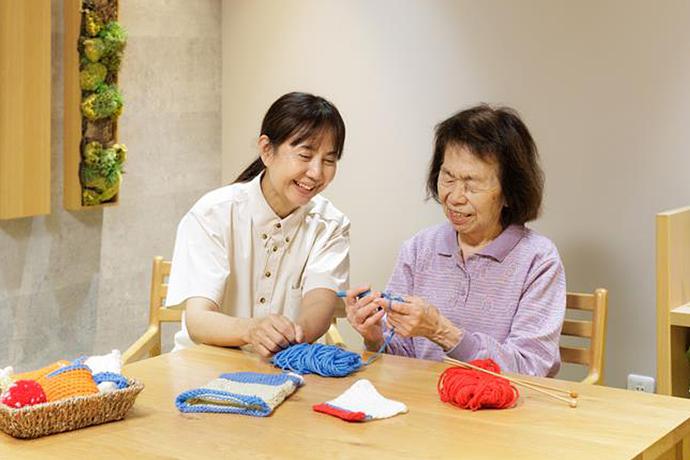 編み物をされるご入居者様 日常の中で楽しみながら続けられる手仕事で 無理なくリハビリを。