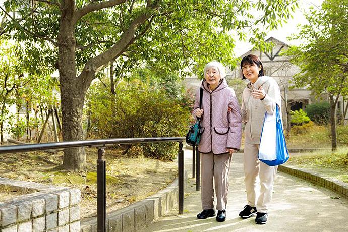 スタッフと一緒にお散歩 ホーム周辺にある桜並木や公園などお散歩スポットが充実。