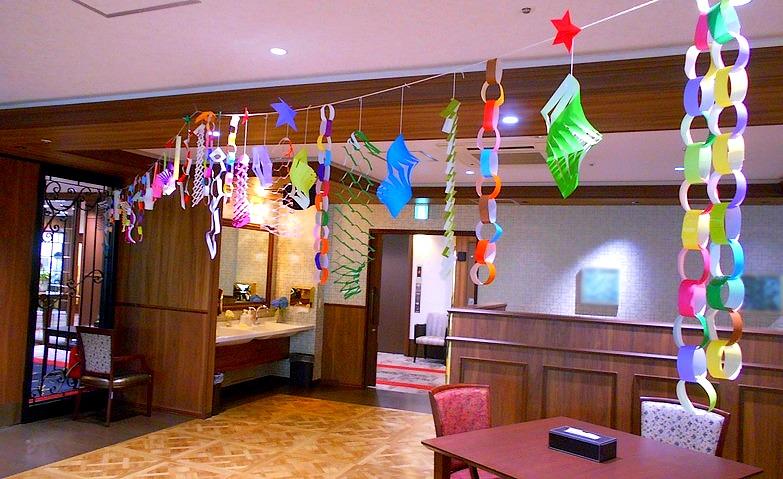 2025.07.07短冊に願いを込めて!7月7日の七夕に向けて、ご入居者様と一緒に笹飾りを制作しました。色とりどりの飾りとともに、短冊には皆様それぞれの願い事をつづっていただきました。当日、ダイニングルーム兼機能訓練室にて飾りつけを行うと、いつもとは違う雰囲気になり、七夕の風情と四季を感じられる日になったのではないかと思います。