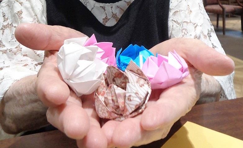 2025.08.30折り紙でお花作りリハビリの一環として行う、人気の折り紙のアクティビティ。無地や飾り模様のある紙など、お好きな折り紙を選ばれ、両手いっぱいのお花を作られたご入居者様。お互いにどこまでできたかを確認しあったり、教えあったりと会話にも花が咲いています。「意外とちっさいのできてかわいいね」「これなら何個も作りたくなるわ!」と楽しまれ熱中されたご様子でした!