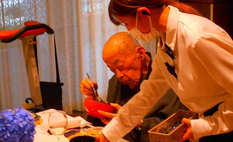 2025.07.08「移動レストラン」~夏の和御膳~7月6日、七夕イブに行われた「移動レストラン」の夏の和御膳のご様子です。ダイニングルーム兼機能訓練室を天の川に見立てた七夕飾りで装飾し、皆様にお食事を召し上がっていただきました。通常年に2回の「移動レストラン」、皆様は少しドレスアップされダイニングルーム兼機能訓練室に来られます。和食に合わせたお酒をご用意し「何年振りかにお酒を飲んでいい気分や」と笑顔でお話も弾んでいらっしゃいました。運ばれるお料理に「わあ~きれいね!」と歓声がわき、あちらこちらで笑い声が聞こえるお食事会でした。