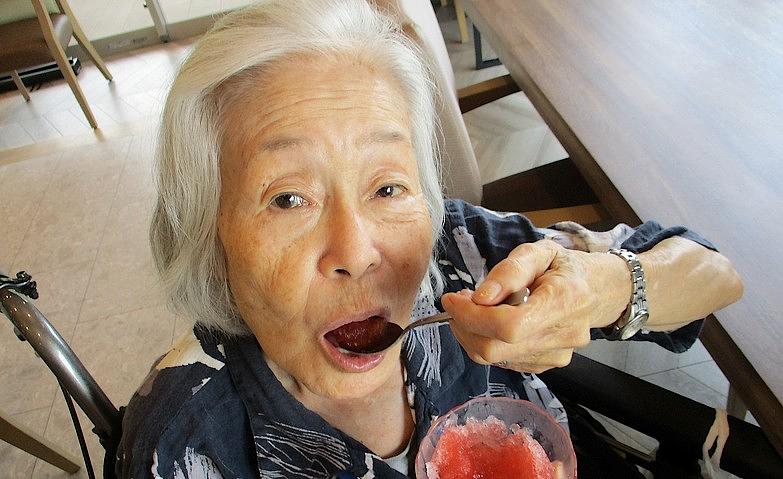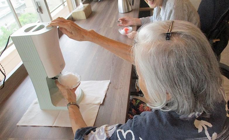 2025.08.09いただきます!暑い日が続くなか、涼を感じようとかき氷づくりのアクティビティを行いました。皆様はご自身で氷を器に盛り付け、召し上がりました。カメラを向けるとポーズをとってくださったご入居者様。「おいしいよ」と笑顔いっぱいでした!