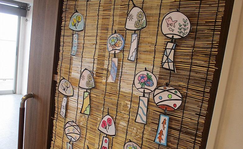2025.08.19夏の飾りつけアクティビティの時間にご入居者様といっしょに風鈴の飾り作りを行い、ダイニングルーム兼機能訓練室に飾り付けました。画用紙で作られた風鈴ですが、すだれに取り付けると風にゆられて涼し気な雰囲気です。「これきれいねえ。上手にできてるわ」と皆様は笑顔でご覧になっています!