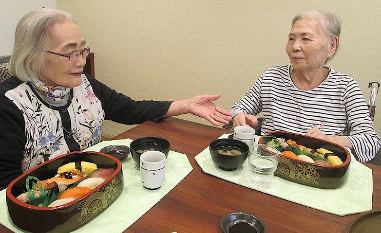 2025.10.31笑顔あふれる昼食のひととき昼食にお好み焼きとお寿司を召し上がったご入居者様。お二人で談笑されながら、ゆったりとした時間を過ごされていました。お好きな料理を前に、穏やかな笑顔が印象的でした。