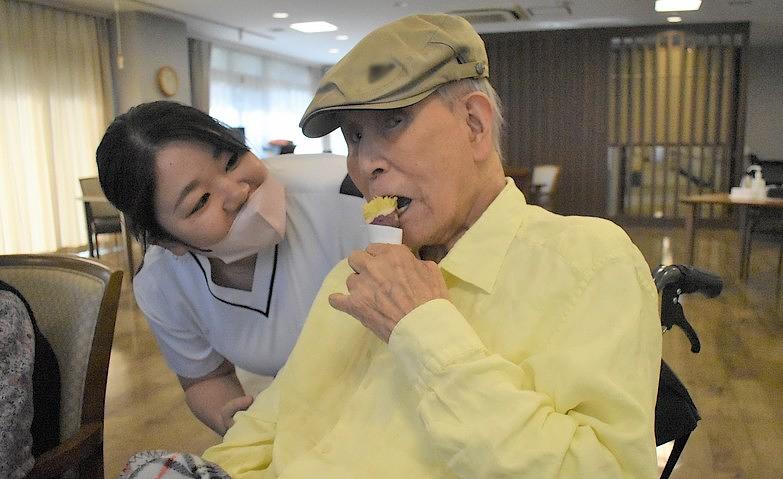 ご入居者様がつくった肉じゃがを安全にお召し上がりいただけるかどうか、嚥下機能を機能訓練指導員が確認します。作ったあとも「おいしい物ができた」と実感していただけるためにも大切にしている時間です。