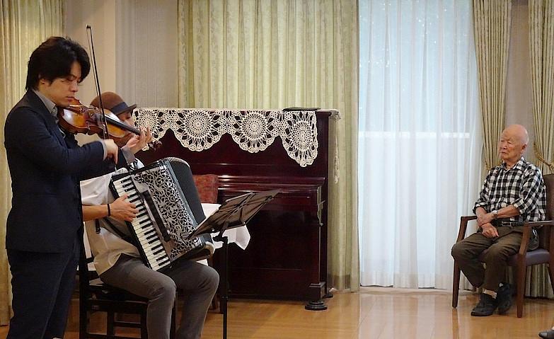 2025.06.09ヴァイオリン&アコーディオンデュオコンサートこの日は「移動レストラン」の日でしたが、お食事の前にヴァイオリン&アコーディオンのデュオコンサートを開催しました。ヴァイオリンとアコーディオンが織りなす美しい音色に、皆様は酔いしれていらっしゃるご様子でした。