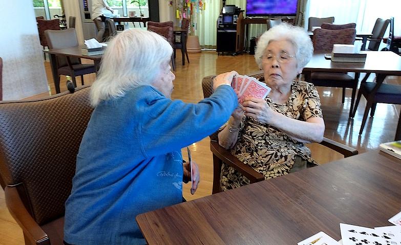 2025.07.23アクティビティ~トランプ~「メディカルホームグランダ夙川東」で定番になりつつあるアクティビティ「トランプ」でのご様子です。この日はふたつのテーブルに分かれて、七並べやババ抜きを真剣に、そして笑い合いながら楽しまれていました。