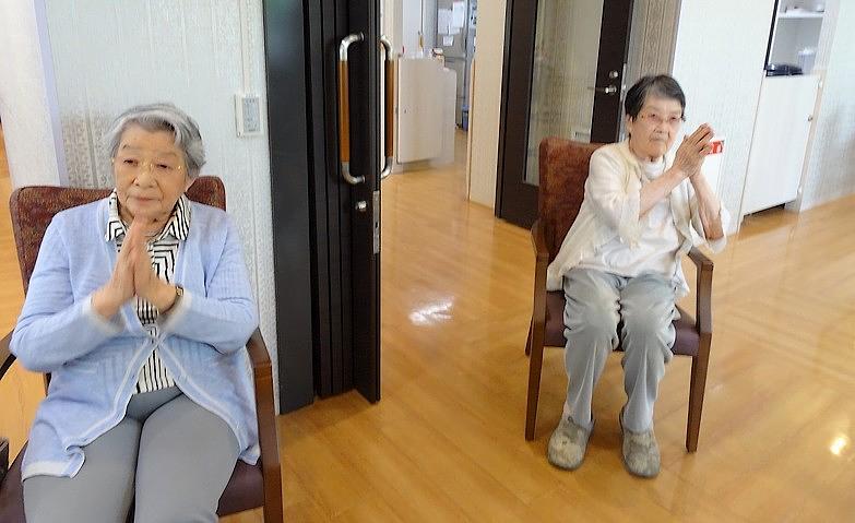 2025.05.24スタッフによる体操通常毎月、皆様が楽しみにされているスタッフによる体操の時間のご様子です。頭とお身体を使いながら行うこの体操、スタッフの出すジャンケンに「勝ってください!」「負けてください!」と賑やかな声が響きます。いつもの馴染みのスタッフが行う体操では、皆様の笑顔が多く見られました。