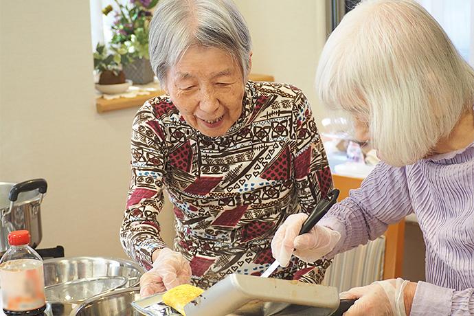 お料理は包丁や火が危険と、ご自宅ではしなくなっていた方も。ホームでも、「危険では?」「お怪我をされたら?」という声が上がりました。しかし、はじめていただくと自然と役割を決めながら慣れた手つきで進められています。できないことのお手伝いはもちろん、「したかったことができた」という達成感や喜びを感じていただけるようなお手伝いに努めています。
