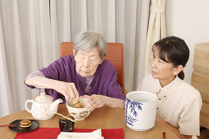 当ホームでは、茶道を長く嗜まれてきたご入居者が多くいらっしゃるため、定期的に本格的なお茶会を開催しています。お茶を点てお仲間やゲストにふるまわれるご様子は、いつもと違う真剣なお顔つきに変わられます。