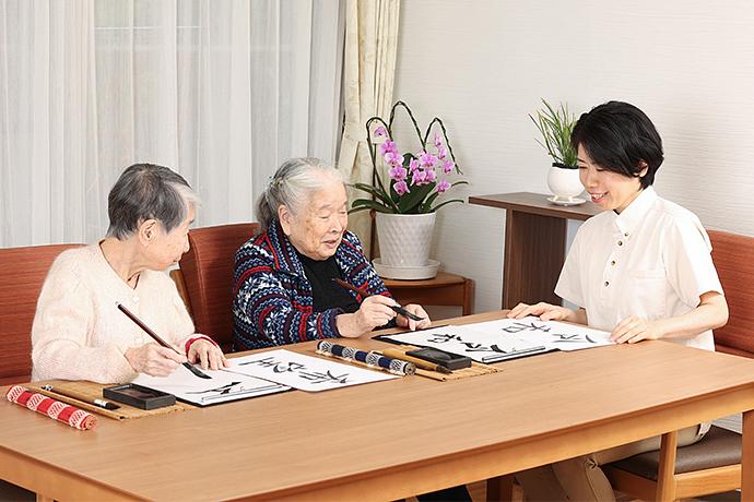 「やりたいこと」が生まれる環境づくりに力を入れています。習字、編みもの、刺し子、運動、お散歩、お茶会、園芸など、ご入居者様がこれまでの人生の中で続けられていたことが継続できるようスタッフがサポートさせていただきます。中には、他のご入居者様の活動に興味を持たれ、新たな楽しみを発見されるなど、活動の輪が広がっています。