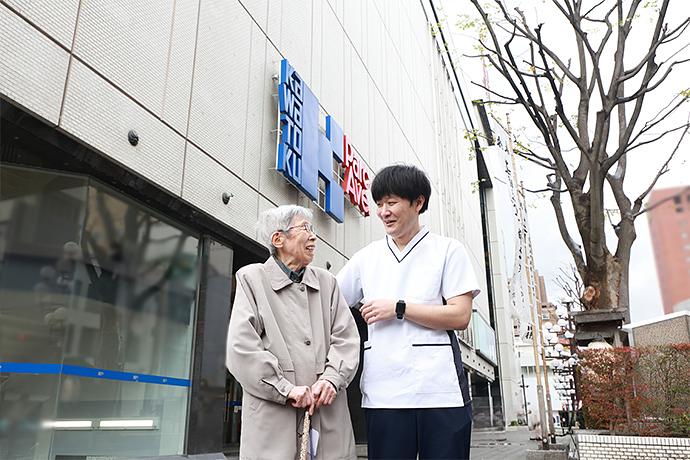 また、個別リハビリの一環として、「カワトク」まで機能訓練指導員と一緒に歩行リハビリされる方もいらっしゃいます。外出できる体力づくりをサポートし、より自立した暮らしを目指しています。※スタッフが出入りのチェックや外出先の確認をしています。また、お一人で外出することが危険な方には、外出を制限させていただく場合がございます。
