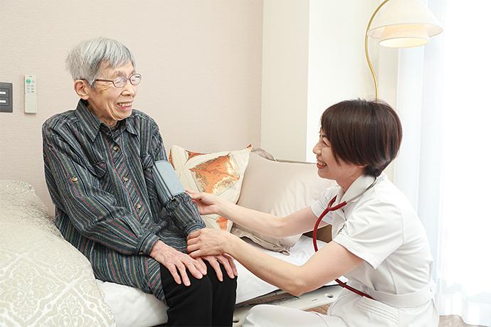 看護職員が健康管理を行っている様子 365日24時間サービススタッフ、365日日中看護職員配置。安心感のなか、「ご自分らしい」暮らしを。