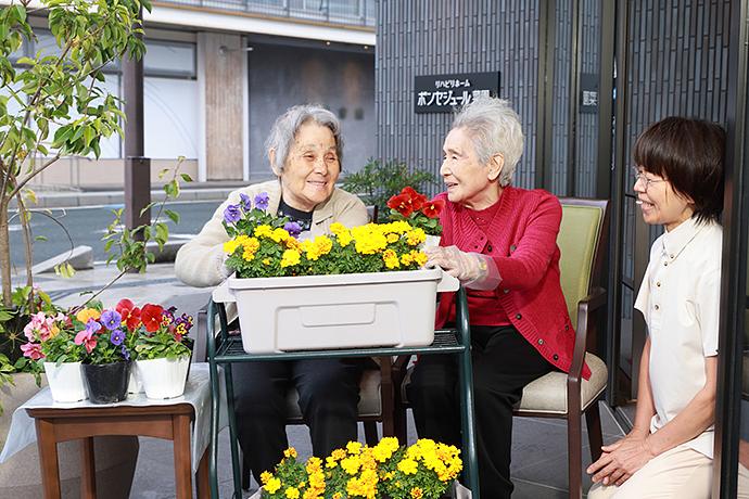 ガーデニングで笑顔のご入居者様 ガーデニングや、スイーツビュッフェ、チアダンス教室など、多彩なアクティビティを実施しています。