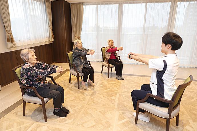 当ホームでは、機能訓練指導員監修のもと、通常毎朝集団体操を行っています。ご入居者様のお身体の状態にあわせたプログラムで、多くの方にご参加いただいております。皆様で一緒にお身体を動かすことで、健康維持やリフレッシュはもちろん、ご入居者様同士の交流も深まっているご様子。毎日の習慣として取り入れることで、自然と運動習慣が身につき、活気あふれる毎日をお過ごしいただけるよう努めています。