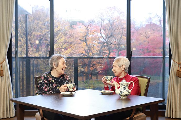 「盛岡城跡公園」の紅葉をご覧になりながらのティータイムのご様子 四季折々の盛岡城跡の景色をホームからも楽しんでいただけるような環境です。