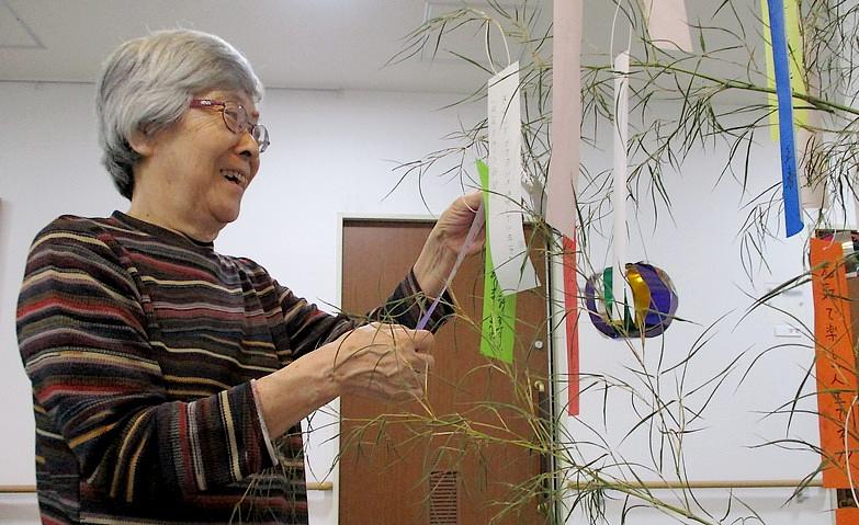 2025.07.06短冊に願いを込めて7月7日の七夕に向けて、当ホームで短冊飾りを行いました。ご入居者様には短冊に願い事を書いていただき、笹の葉に飾りつけをしました。「長生きできますように」と願い事を書かれたこちらの方は、「お互い健康に過ごそうね」と明るくお話ししてくださいました。たくさんの願い事が飾られた笹の葉は、ホームを華やかにしてくれています。