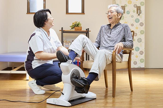 機能訓練指導員が作成する個別のプランのもとに行う個別リハビリでは、お身体の状態やご要望に合わせて、生活の質(QOL)の向上を目指した多様なプログラムを機能訓練指導員がご提案。このほかにも、足腰が不安な方の筋力維持を目的とした体操や、リハビリ機器を使用した運動などを通して機能面や精神面(こころ)のサポートを図ります。歩行訓練などは、機能訓練指導員の作成したリハビリプランのもと介護職員が行い、安心感のある生活を送っていただけるようお手伝いをさせていただきます。