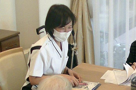 「いつまでも好きなものを食べていきたい」という想いの方に咀嚼嚥下機能の評価を行い、その方に合った食事形態や水分のトロミの量を提案します。加齢や脳血管疾患による咀嚼嚥下機能の低下は誤嚥につながります。口腔嚥下体操はそうした機能低下や誤嚥を防ぐために、介護職員でも通常毎日行っています。また認知症や失語症でコミュニケーションの難しい方に書写や計算、語想起などの認知機能・言語機能訓練を行います。