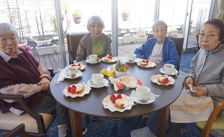 不定期でご入居者様に自由参加でお集りいただいて、お茶やお菓子、お酒(医師の許可のある方※)をお出しし会話を楽しむ会を催しています。ホームでお知り会いになり、それぞれの昔話や好きなことなど会話に花が咲いています。