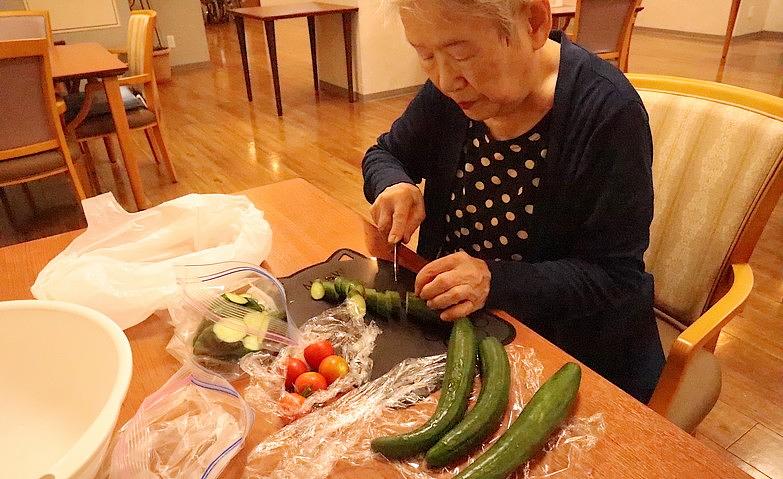 2025.08.06夏野菜の浅漬け日差しに恵まれ、当ホームの夏野菜が順調に育っています。今回は、収穫したきゅうりとトマトで浅漬けを作りました。「大きなきゅうりね」とおっしゃり、包丁でカットしてくださいました。「昔取った杵柄だわ」と笑ってお話しされ、懐かしみながら浅漬けを作ってくださいました。夕食でご入居者様にお配りしたところ、「新鮮でみずみずしいわ」「おいしいわね」と皆様喜んでくださったようです。