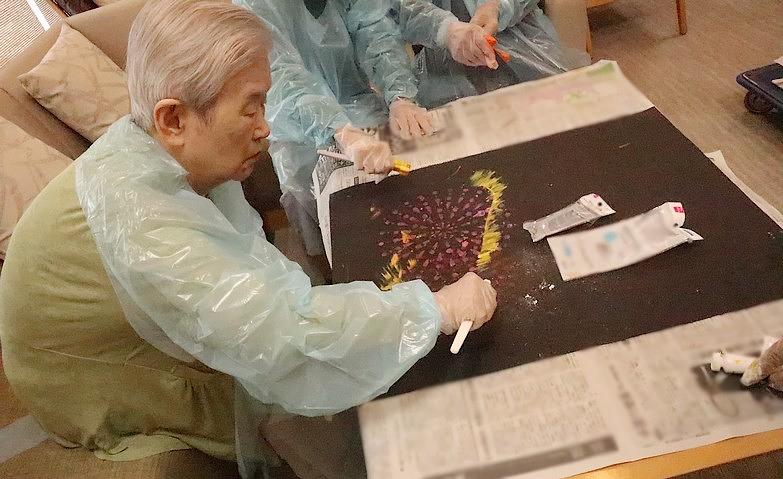 2025.07.17美術展に向けて8月に外部会場にて開催予定の、川崎市・横浜市・町田市などのベネッセの30ホームにお暮らしになられているご入居者様が制作された絵画などのアート作品を展示する「紡ぐ美術展2025夏」。その美術展に出品する作品を制作中です。スパッタリングという手法を使い、絵具を飛ばして花火の絵画を皆様で作成されています。お一人おひとりの力を合わせて作られている、精魂込めた作品です。ぜひ会場でご覧いただければと思います。