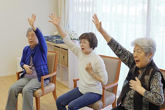 「いつまでもお元気にお過ごしいただきたい」「将来の介護に不安を感じている方のお手伝いをしたい」という想いから、筋力向上、バランス、柔軟性、反射能力に効果があると言われ、車椅子の方も参加できる介護予防体操を通常毎日実施しています。お身体を定期的に動かすことは、さまざまな健康増進に役立ちます。また、機能訓練指導員による体操も通常週に1回実施しています。