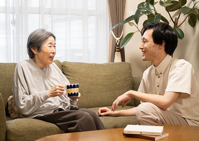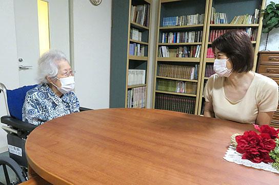 スタッフと歓談のご様子 お一人おひとりの「やりたいこと」「続けたいこと」を行っていただける環境づくりを