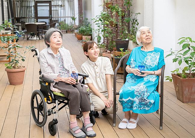 ウッドデッキテラスでスタッフとお話しされるご入居者様 ウッドデッキテラスで、癒しのひとときを