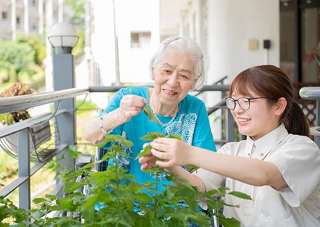 大葉の収穫をされるご様子 駅近でありながら閑静な住宅街に佇むホームです。玄関では野菜を育てています。