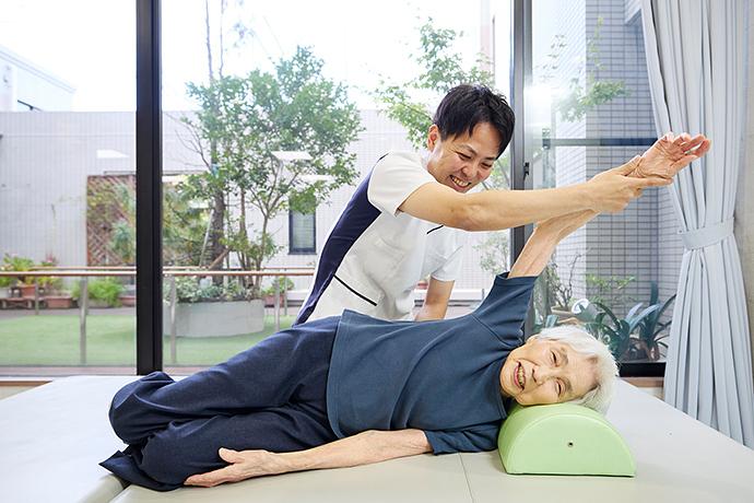 「リハビリホームくらら鷺沼」では、ご入居されてから3ヶ月間程度、通常週5日まで個別集中リハビリをご提案しています。機能訓練指導員がお一人おひとりのお身体の状態に合わせたリハビリメニューを作成し、介護職員と個別で集中的に行います。その他にもご入居者様が集まって行う集団リハビリや体操など、これまでのご生活の維持向上をはかりながら、ハリのある暮らしをお送りいただけるようサポートさせていただきます。