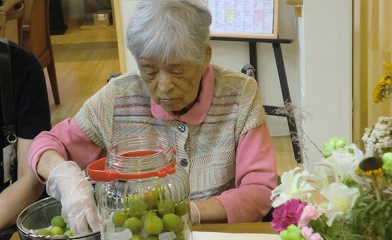 2025.07.14もうすぐ飲み頃です!先日、皆様と一緒に梅シロップを作りました。まずは、青梅のへたを取ってよく洗い、水気をふき取っていきます。時には、「小さくてよく見えない」と少々苦戦されている場面も。へたを取り終えたら、氷砂糖と青梅を交互に瓶に詰めて行きます。あとは、お砂糖が溶けるのを待つばかり。皆様は毎日のように瓶をのぞき込んでい、出来上がりを心待ちにされています。